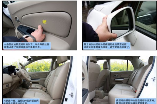 启辰D50的内饰风格和颐达基本没什么区别,整体风格仍然突出了家用车的简洁化,内部做工则依然保持着颐达的优良水平。但也有很多地方的配置缩水,比如内部的软性材料变硬了,电动调节的外后视镜等。配置不是启辰D50的优势,但空间非常不错,车内的空间却得到了最大程度的利用,前后排的腿部和头部空间都十分宽裕,使用中能更好地满足家用需求。