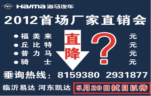 编辑从海马汽车昆明博尧4S店获悉,“新福美来百城幸福欢go汇”已在全国范围内陆续开展,临沂站活动将于本5月20日上演,想拿厂家直销购车政策和丰富大礼需要先拨打0539-8159380报名电话与4S店确认信息。相信临沂站将成为海马汽车厂方、海马汽车客户和4S店共同的节日。
