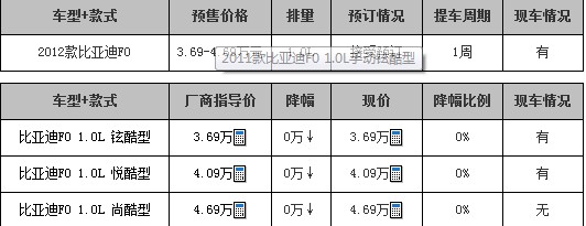 日前,搜狐汽车编辑从比亚迪汽车临沂燕华4S店了解到,2012款比亚迪已经到店,目前接受预订,订金1000元,提车周期1周左右。到店车型为:2012款比亚迪F0炫酷型、2012款比亚迪F0悦酷型。目前店内无2012款试驾车型,有老款试驾车可供试驾。感兴趣的朋友不妨到店内了解详情。