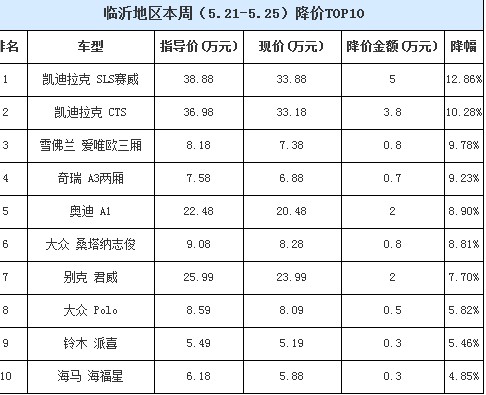 临沂一周降价TOP10——凯迪拉克降5万元领衔