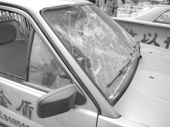 27日下午,在北城汽车站,市交通稽查支队工作人员查到了一辆涉嫌套牌的出租车,就在执法人员对该车司机进行检查时,该车司机突然发飙,从车上抽出铁棍往自己的车上砸,后来铁棍被执法人员夺走。