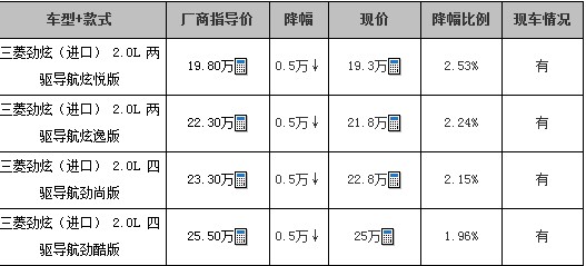 临沂地区进口三菱经销商处了解到,目前店内劲炫有现车,目前购车均可享受5000元优惠。另,店内配有该款车型试驾车,且提供购车贷款以及保险等金融服务,感兴趣的朋友不妨到店内赏车试驾后,作购车定夺。