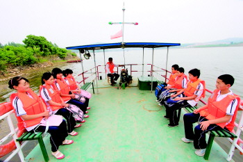 每周五下午,中高湖初级中学学生放学,马富明驾船准时在高湖水库西岸等候。用不了一会,学生们结伴从岸边的桃树林里走出来,穿上救生衣登船回家。到了周日下午,马富明则在库东村的渡口等学生们乘船到学校上学。