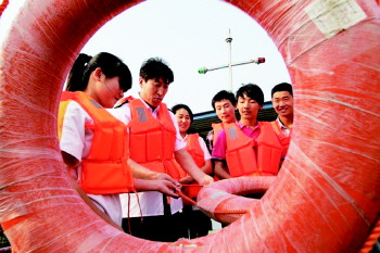 ◤上船之前孩子们依次穿上救生衣。 通讯员 孙兆明 摄