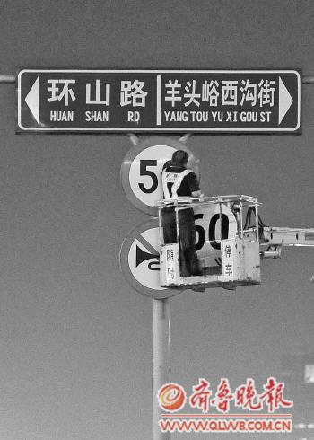 5月31日晚7:30,工作人员在经十路更换限速牌,该路段限速由50公里/小时,提高到60公里/小时。                 本报记者 邱志强 摄