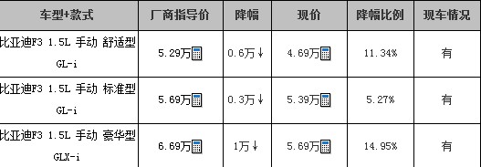 近期购买2012款比亚迪F3豪华型可享10000元现金优惠,其它车型也有不同程度的优惠。现车方面:目前店内现车充足,颜色有银白色和黑色。店内有试驾车,可试乘试驾。欢迎感兴趣的朋友到店详询。
