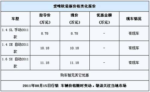 日前,编辑电访了临沂某汽车销售服务有限公司雪佛兰4S店工作人员了解到,2011款爱唯欧现车较为充足,暂时没有任何优惠。若有感兴趣的朋友可到店或电话咨询经销商。