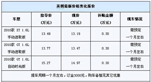 近日,编辑在临沂汽车销售服务有限公司通用别克4S店获悉,目前店内英朗暂无现车,购车需要预订,预订时间较长,提车周期在一个月左右,订车订金为3000元,店内1.6L车型均享受3000元节能补贴。店内现有试驾车可供试驾,喜欢该车的朋友可以到店赏车试驾,早做决定。
