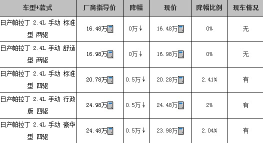 现在购买日产帕拉丁可享现金优惠5000元。现车方面:目前店内仅有黑色现车,其它颜色需要预定,定金5000元,月一个月后提车。感兴趣的朋友不妨到店详细咨询。