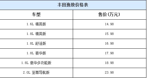 丰田逸致正式上市 售价14.98万-23.98万