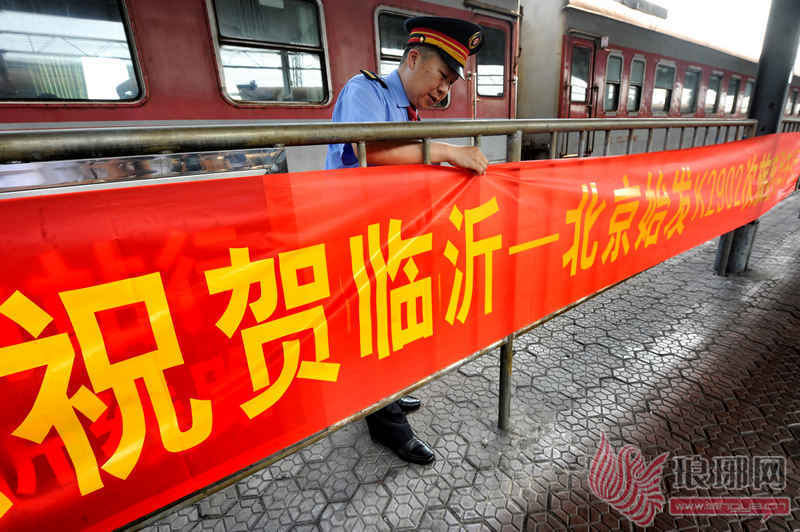 3日下午,临沂火车站二号站台南侧,红色的列车静静地卧在轨道上,这里没有隆重的仪式,只有一个简单的祝贺横幅,临沂发往北京的K2902次始发列车静悄悄地迎接首批乘客。