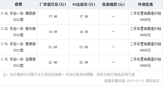 注:该行情报价仅限于本文所述经销商。市场价格波动频繁,实际价格以到店咨询为准信息采集时间:2012-07-12 易车临沂
