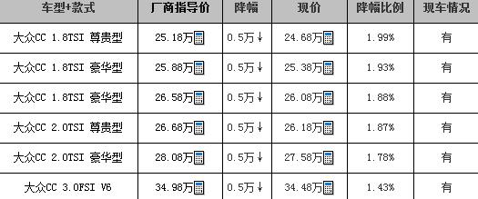 近日,笔者从临沂地区一汽大众某4S店了解到,目前大众CC全系优惠5000元现金。店内有1.8T尊贵型现车一辆,颜色为开罗金,要买其他颜色车需要预订,提车需等待2-3周。感兴趣的朋友可以到店详细咨询。