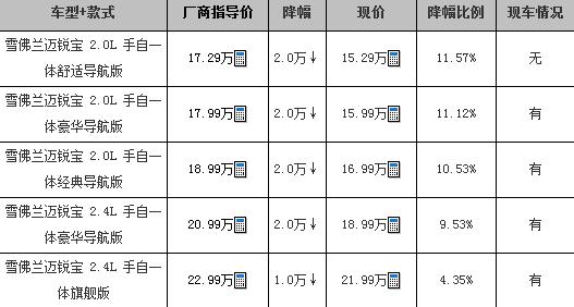 编者建议:迈锐宝是一款雪佛兰推出的动力性能和操控性能兼顾的中级车,外观设计时尚,整体车身线条流畅;内饰造型采用环抱式设计,车内用料比较不错;空间够用,舒适度较高,但是从价值16.29万元的车竟不配导航来看配置方面不够突出,市场反响一般。目前降价幅度尚可,有意者可到店赏车试驾。