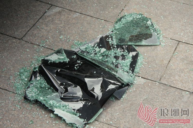 被砸碎的玻璃被扔在地上。