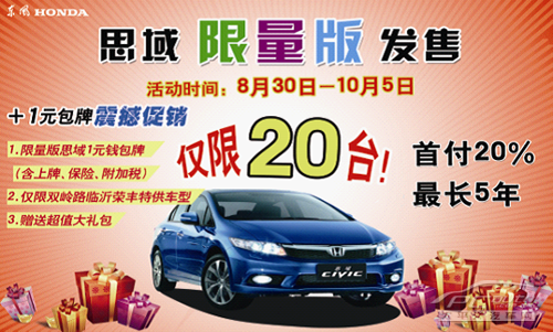 1.限量版思域1元钱包牌(含上牌、保险、附加税)2.仅限双岭路临沂荣丰特供车型3.赠送超值大礼包