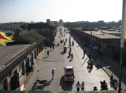 俯瞰古城,笔直的街道,对面远处是另一个城门,古代的城还真是小呀,一眼就望到头了,街道两边都是店铺,卖什么的都有。