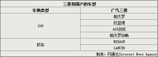 在本月广汽三菱首款车型ASX劲炫已经正式下线,网通社从广汽三菱官方出获悉:新车将在今年年内正式上市。广汽集团总经理曾庆洪介绍:“广汽三菱不仅生产SUV,轿车将来也可以生产,比如LANCER等都是现有产品。”,如上表所示广汽三菱未来将投产4款SUV车型并且在将车方面除了会生产LANCER外还将生产型车三菱MIRAGE,届时广汽三菱的产品线将趋于完善。