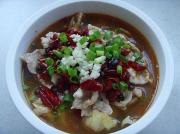 11. 将事先炸好的干辣椒、花椒,撒在肉片上,蒜末、葱花也均匀撒在肉片上。