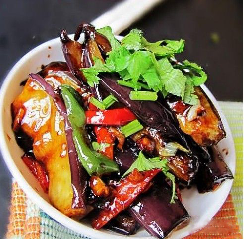 8、倒入炸好的茄子翻炒。