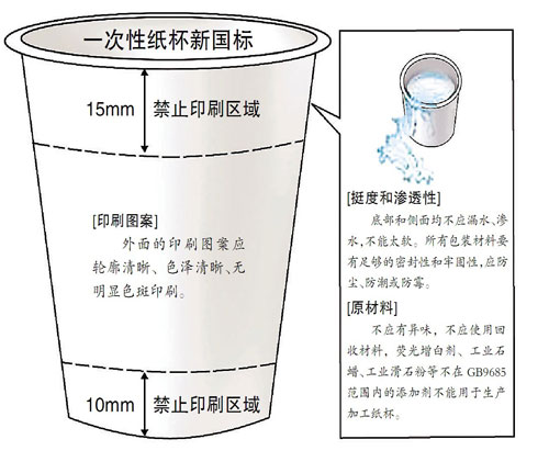 按照新国标(GB/T27590-2011)规定,纸杯外面的印刷图案应轮廓清晰、色泽均匀、无明显色斑,但“杯口距杯身15mm内、杯底距杯身10mm内不应印刷”。