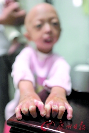 苏兰芝表示,小琳是九个月大的时候发病的。2005年底,34岁的黎新贵和比他大一岁的苏兰芝结婚,第二年10月份,他们的大女儿小琳出生了。然而,喜悦并不长久。小琳在9个月大时,手脚上出现了一些黑斑。后来情况越来越严重,手指和脚趾上又开始长类似烫伤的疤痕,最后,手指和脚趾渐渐开始萎缩。