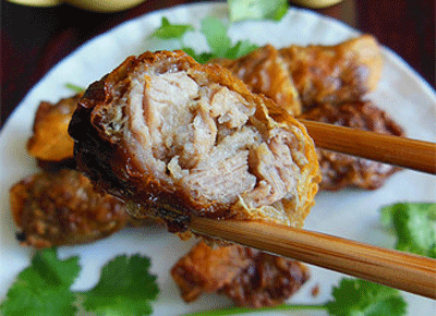 9.油锅放在中火上,待油烧至六成熟后,加入五香生坯炸至表面金黄,整条下锅炸,待五香卷浮出油面后,用筷子翻面炸匀,至金黄色后,捞出沥油,切片即食。