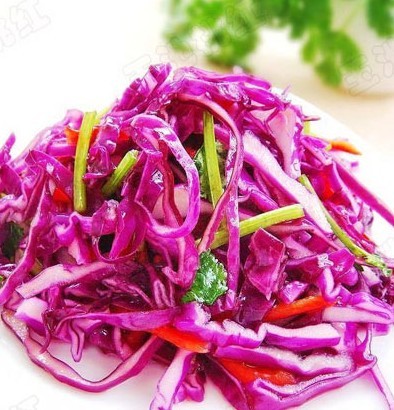 5、紫甘蓝  烹调时容易变蓝。紫甘蓝里天然的花青素在中性条件下是蓝紫色,而偏碱性时会变为蓝色。因此,处理方法要和绿色蔬菜正好相反。需要创造酸性条件,盖着锅盖就利于颜色的保持,稍微加点醋,紫甘蓝颜色会更红艳。