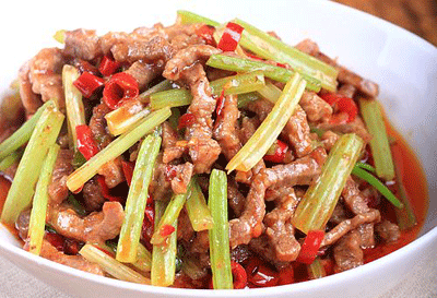 5.锅内留少许底油,煸炒葱、姜、蒜及青红椒、泡辣椒,加入郫县豆瓣煸炒,炒出香味后放入滑熟的牛里脊,加蚝油、少许糖调味,最后加入香芹段煸炒,根据自已的口味轻重适量放少许盐,翻炒均匀后完成出锅。