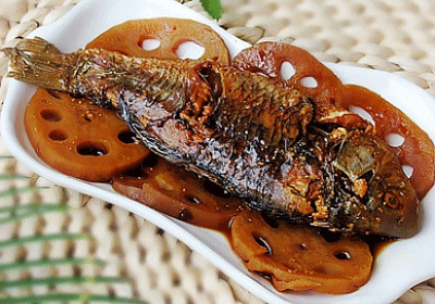用料:黑背小鲫鱼500克,莲藕一节,无肉猪肋骨适量,冰糖50克,葱适量,姜25克,酱油100克,香醋25克,黄酒50克,香油适量