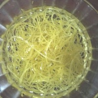 5. 刮好的柚子皮,是不是真的又细又薄呢?把柚子皮放入淡盐水中浸泡十几分钟,这样可以去除一部分苦味,当然,如果你比较喜欢苦一点的,这一步也可以省略,如果不太喜欢苦味的,泡一宿也可以。