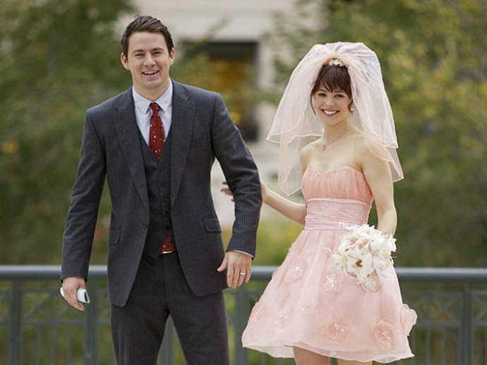 《誓约(TheVow)》 ,Paige(RachelMcAdams饰演)选择了一条珠片镶嵌的粉色抹胸礼服,裙摆刚刚及膝。活泼可爱,不失为非传统婚礼的最佳选择!