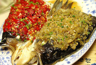 4.分别将剁椒和佐料拌匀,盖在鱼头的两边,放入蒸锅,大火蒸10分钟,最后倒掉一些汤汁,淋入热油即可。