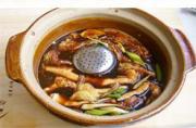 6. 把腌好的五花肉放入沙锅中,肉中间放一层葱、姜片,再放一层肉,将腌制肉片剩下的酱汁倒入锅里,加少许清水。