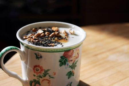 黑芝麻含有大量的脂肪和蛋白质,还有糖类、维生素A、维生素E、卵磷脂、钙、铁等营养成分。其中丰富的维生素E,有很强的抗氧化活性,不但能减缓皮肤衰老,还能滋润皮肤。中医学认为,黑芝麻能益肝补肾、养血润燥、乌发美容,是极佳的美容食品,且其中含的脂肪大多为健康的不饱和脂肪酸。酸奶不但含有牛奶的所有营养,还比牛奶更好消化,同时维生素B族也更多,堪称营养最全面的食物。吃酸奶的时候,撒上一勺黑芝麻,不但香气浓郁,润肤抗老的效果也更强。