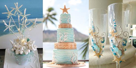 贝壳元素餐桌装饰、海星婚礼蛋糕、海洋元素玻璃杯