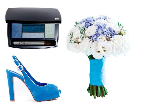 蓝色眼影、海蓝色鱼嘴高跟鞋、蓝色新娘手捧花
