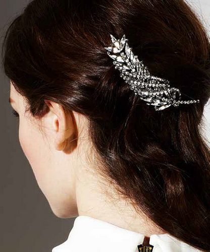 叶子形状的发饰可以作为盘发造型的点缀之物,特别是对于深色头发的人来说,盘发很容易显得有点老气,而带上这种BLING BLING效果的发饰就能立马起到点睛的作用。