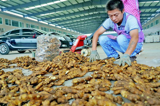 2日,在潍坊安丘盛大农产品市场,一名收购商正在晾晒生姜。本报记者 张頔 摄
