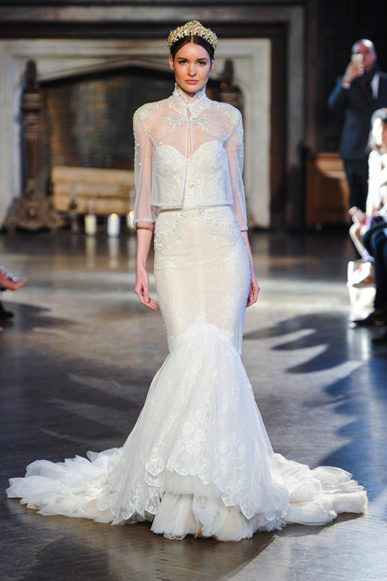 导语:无论是高级定制的压轴婚纱,还是纽约婚纱周的秀场,都在告诉我们一件事——婚纱与时装的界限越来越模糊。尤其是秋冬婚纱中,混搭一件小外套渐成趋势,既保暖,又可以让婚纱的样式更加新颖丰富。下面就来跟小编一起看看大师们是如何玩转外套与婚纱的搭配的吧!