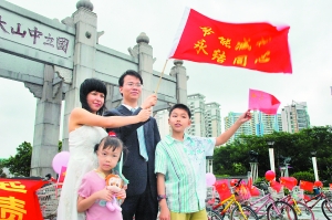 时报讯 (记者 黄鹏 实习生 李慧芳) 十几辆双人自行车缓缓行驶在雨后的滨江路上,其中一辆坐着一位西装革履的男子和一位穿着白色靓丽婚纱的女子,车队蜿蜒驰行……昨日下午14时,一支如此独特的车队从中山大学北门驶出,原来这是一场特殊的“环保婚礼”。