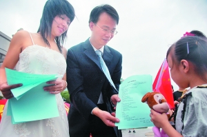 两位新人派送可爱公仔给小朋友,并手持蓝色的《婚礼节能倡议书》,宣传节能环保。 时报记者 巢晓 实习生 朱德文 摄