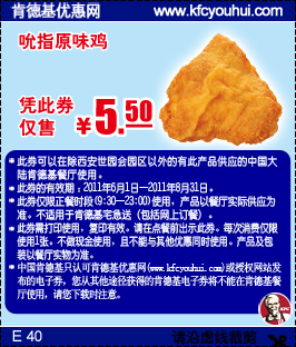 肯德基优惠券(当季优惠券):吮指原味鸡 优惠价5.5元