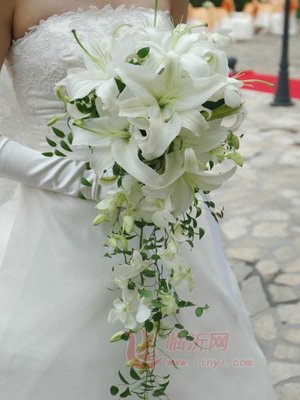 5.下垂形:下垂形捧花弹性极大,可华丽,可清新雅致,可乡村风,也是较人气的款式。以高挑、气质佳的新娘或豪华且有长裙摆的礼服最能匹配了。