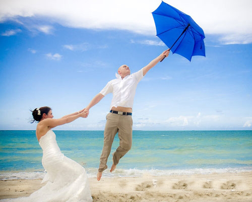 人体脱离地面浮游,是很不现实的。但借助道具,可以让浮游婚纱照更“公道”一些。如运用伞、气球等,都给浮游一个夸张想象的载体,冲淡照片的诡异感。