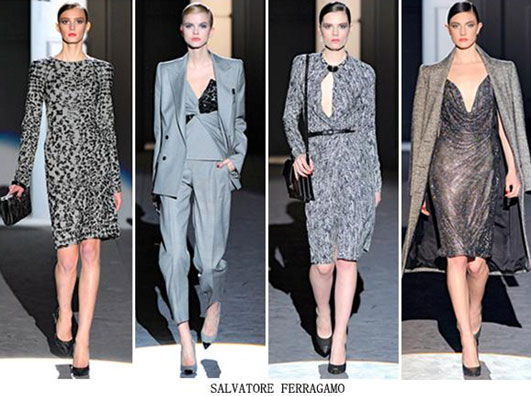 Salvatore Ferragamo2011秋冬女装系列是一场微妙的魅惑游戏。一位捉摸不透的女子,诠释着各种对比反差的魔力,并在不经意间将男性魅力与女性柔媚、慵懒与严肃、细微与大气完美融合。色彩方面,整个系列被黑白灰支配着,在无尽的争斗与混杂后,黑白色褪变为灰色。浅灰、深灰、银灰各种色调俱全,与蕾丝的结合,与千鸟纹、人字纹、格纹的运用,让灰色大放光彩。