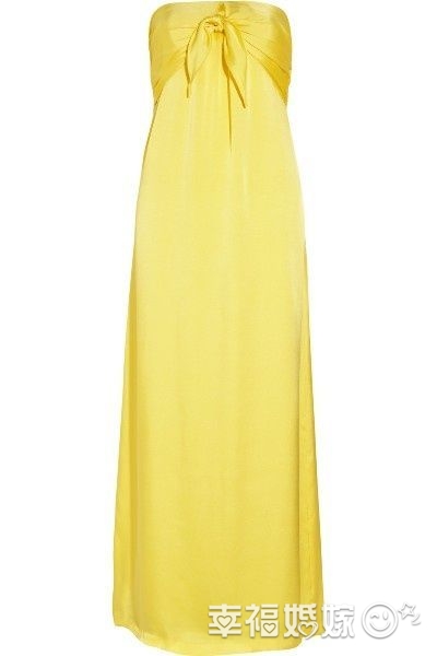 缎面的明黄色高腰抹胸小礼服,搭配珍珠长流苏耳坠,让伴娘摇曳生姿。