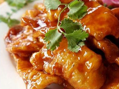 3.勺内放少许水,加糖炒至呈浅黄色的糖浆,倒入炸好的白肉,端离火口,边颠边撒青红丝、芝麻,使糖浆全包裹在白肉上即可出勺。