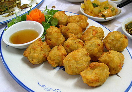 1.虾仁剁成细泥,加肥肉末、葱姜汁、鸡蛋、干淀粉、盐、味精、胡椒粉调匀成馅,放温油中炸熟,呈金黄色时捞出,放盘中。