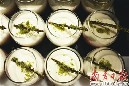 浅尝一款用牛奶米饭做成的甜点,搭配上浓度较高的果酱,没有经过糖分的稀释,果酱保留了原有的酸度,第一口让舌尖有种触电的感觉,配上香浓的牛奶米饭,当酸度逐渐降低后,果香和牛奶香混合在一起让人回味无穷。